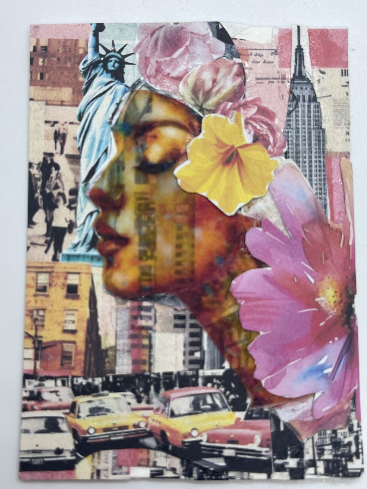 Floral Crown Portraits Series – l This original ACEO is part of my contemporary collage art collection. Each piece is built on a standard ATC card (2.5 x 3.5 inches) and layered with texture, color, and emotion. I create in reverse: building the focal point first, then developing the background arou...